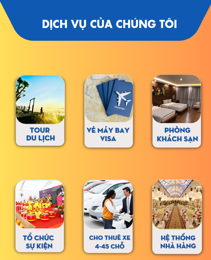 Là đơn vị hoạt động trong lĩnh vực du lịch, tổ chức sự kiện, giáo dục trải nghiệm cùng các dịch vụ khác như cung cấp vé máy bay, phòng khách sạn, cho thuê xe du lịch, xe chuyên gia, … chúng tôi luôn lắng nghe và tìm hiểu những sản phẩm mới phù hợp với thị trường, đáp ứng mọi nhu cầu đa dạng của Quý khách hàng.